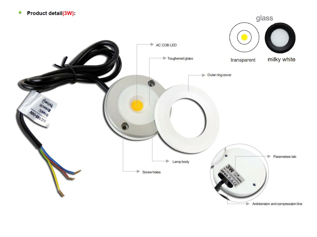 220VAC - No extern Transformer- 3W- 100Lm/W -3000K - IP65 - House Color:Black