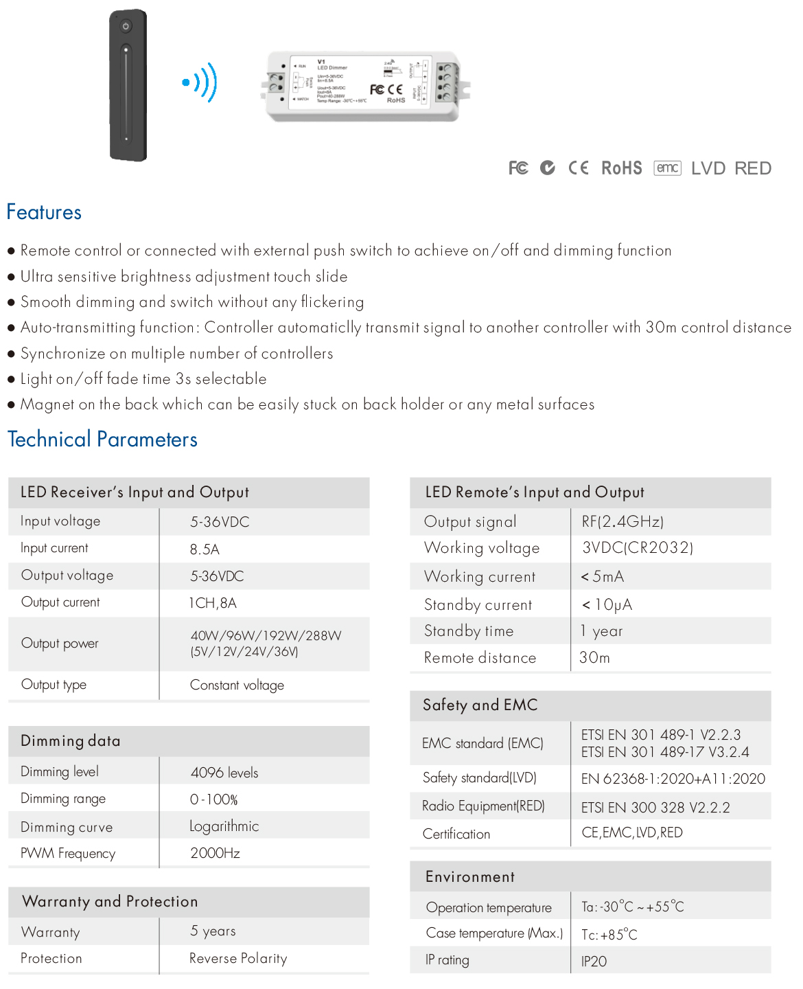 Set: Remote dimming controller for single color LED-Strips - Compatible with Tuya App on smart phone